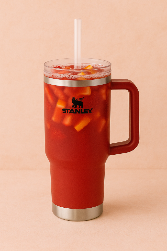 Instructions: Fill your Stanley halfway with ice and a handful of fruit or just fruit. Add everything except the soda, save that for the end. Top off with soda. Garnish with cherries and enjoy!